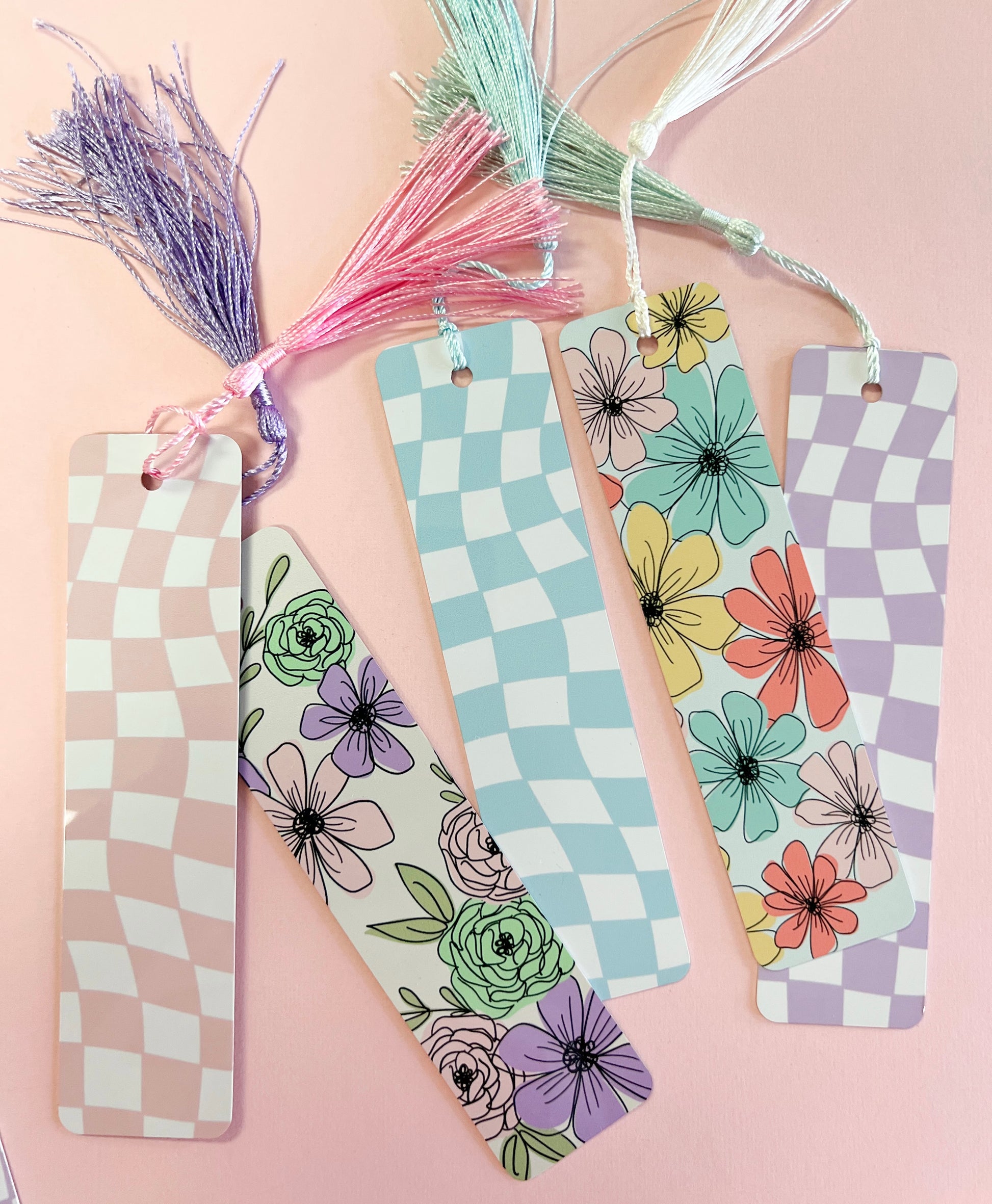 Bookmarks are made out of thin aluminum. They measure 1 1/2 by 6 inches. Made to order and come with a tassel. These can take up to one week to be ready, since they’re made to order! Tassel color may vary.