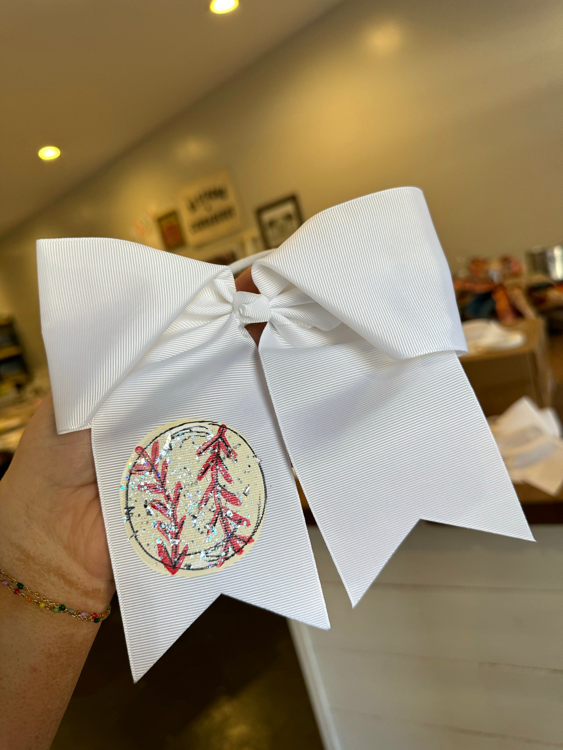 Bows are all hand painted with glitter and come with a ponytail holder attached!
